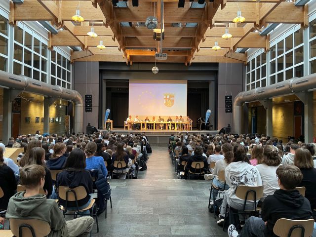 Brennende Themen, wie die kurz vorher festgelegten verpflichtenden Ankündigungen von Überprüfungen waren ebenso Thema wie auch die Frage „Warum man eigentlich an einem Gymnasium sein Abitur machen sollte, wenn es doch auch andere, eventuelle einfachere Möglichkeiten gibt sein Abitur zu erreichen“. Herr Teuber beantwortete dies mit dem Niveau von außerschulischen Veranstaltungen. Eine Schule sei so viel mehr wie die reine Leistungsüberprüfung und forme fürs Leben. Herr Teuber betonte die gewinnbringende Vielfältigkeit der Bildungslandschaft in Rheinland-Pfalz und in Deutschland und verwies auch auf die Eignungsprüfungen an Universitäten für bestimmte Studiengänge. Ein weiteres zentrales Anliegen der Schülerinnen und Schüler war der Übergang von der Grundschule zum Gymnasium. Hierbei wurden Fragen zur Unterstützung und Integration von Schülerinnen und Schülern angesprochen, die den Übergang als herausfordernd empfinden. Herr Teuber berichtete von den Erfahrungen in seiner Familie und betonte immer wieder, dass man gemeinsam im Gespräch bleiben müsse, um die Bildung in Rheinland-Pfalz weiter zu verbessern.