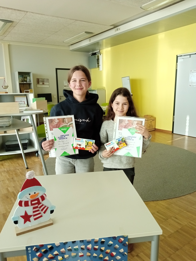 Beide erhielten je eine Urkunde und einen Buchgutschein als kleines Geschenk, wie auf dem Foto der strahlenden Siegerinnen zu sehen ist. Wir bedanken uns nochmals bei allen Teilnehmern und wünschen Greta und Nele für die nächste Runde weiter starke Nerven und gutes Gelingen.
